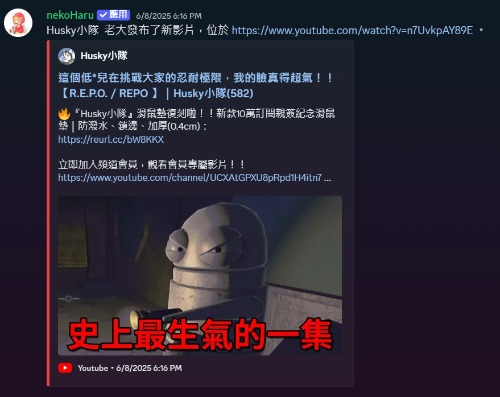想在 Discord 伺服器裡自動收到 YouTube 上傳通知?「nekoHaru」這款專門設計的中文管理機器人能幫你在指定頻道推送 YouTube 影片更新,不再錯過任何新影片。簡單易用、免費安裝,還有中文控制面板和管理功能,讓你的社群經營更輕鬆。