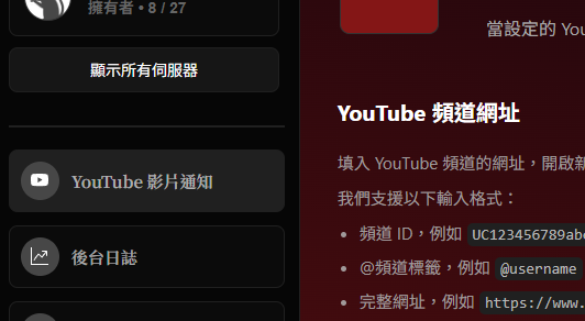 選擇伺服器後,左側功能選單會出現各個管理選項。點擊「YouTube 影片通知」,進入設定畫面。