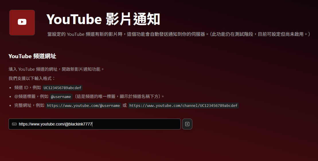 這裡支援頻道ID、@頻道標籤、完整網址,輸入好之後,按下欄位右邊的「+ 加號按鈕」就能新增頻道。