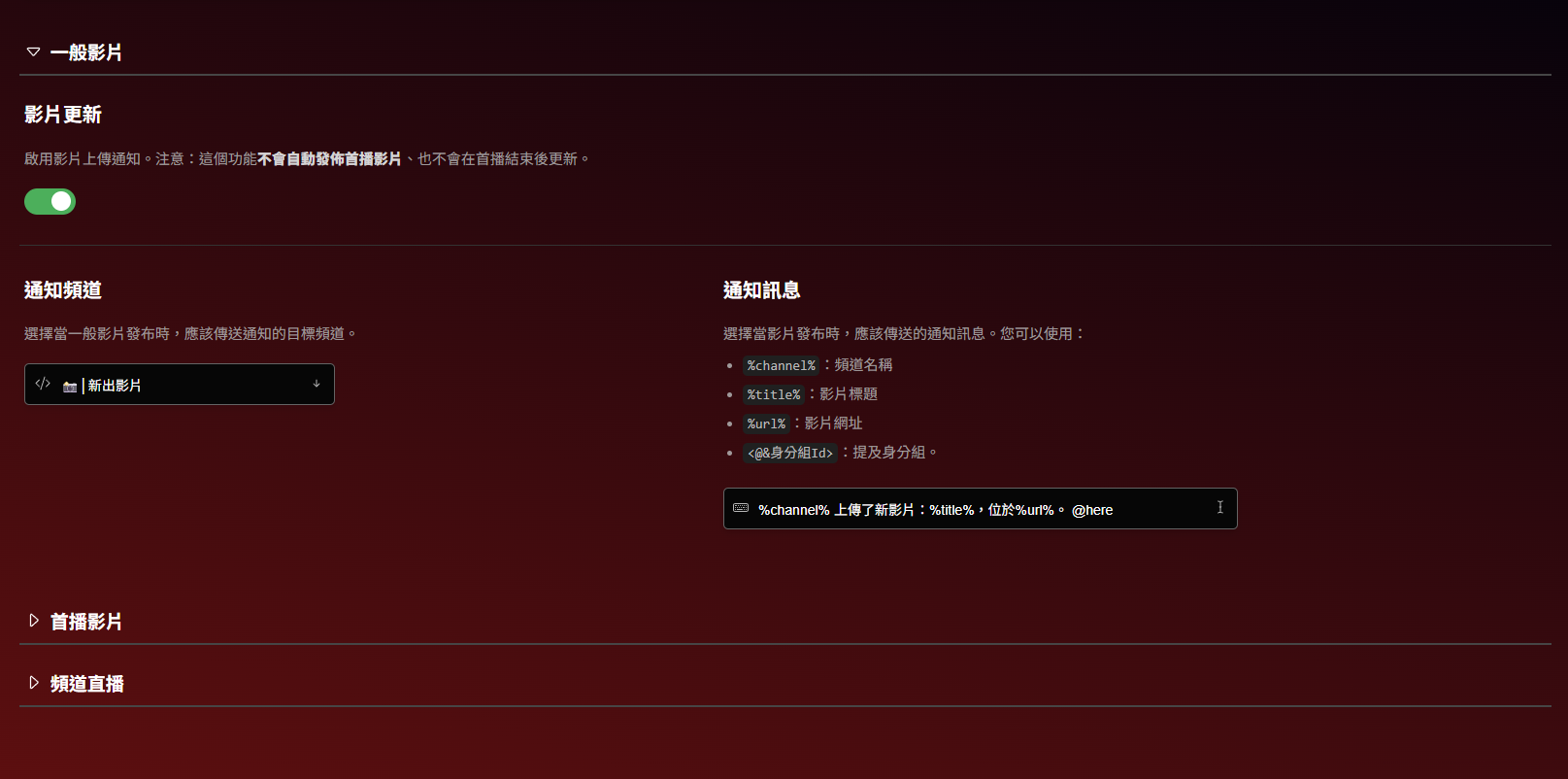 只要設定好 YouTube 頻道連結,機器人就能自動在指定的頻道推送新影片更新,確保成員不會錯過任何新內容。